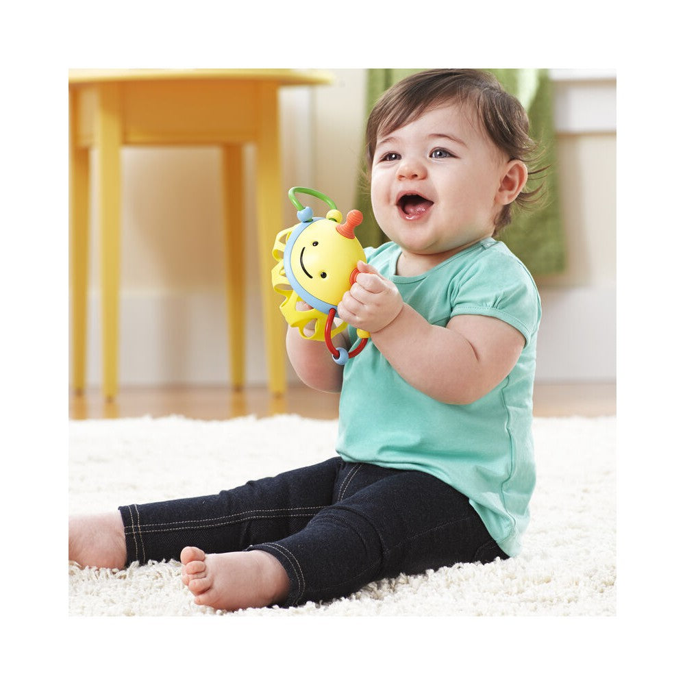 This familiar face engages baby in developmental play. The flexible body has easy-to-grasp openings that help little hands build dexterity. The rattle encourages rolling, shaking and tossing, while teethable surfaces and colorful beads offer more to touch and explore.