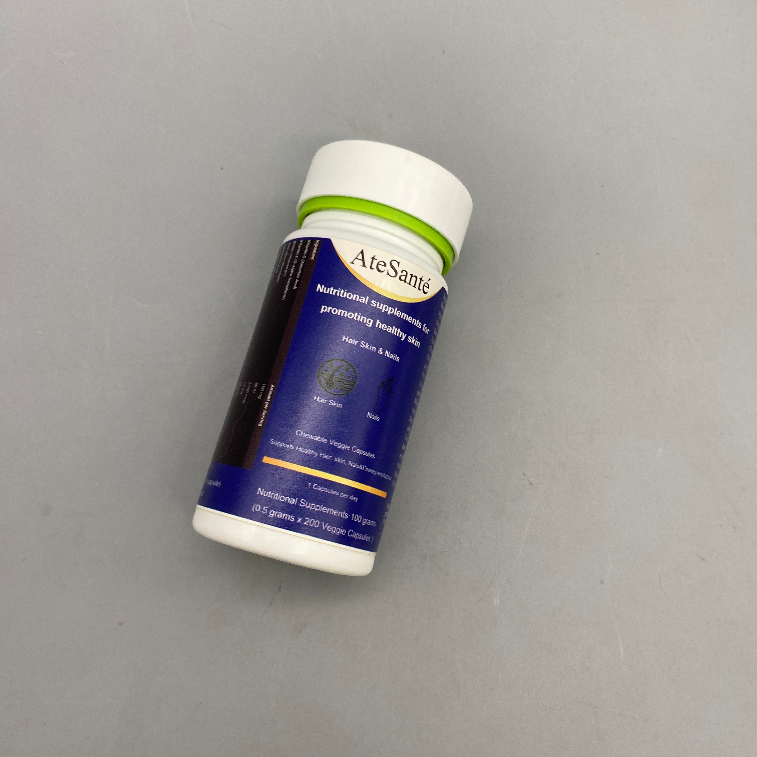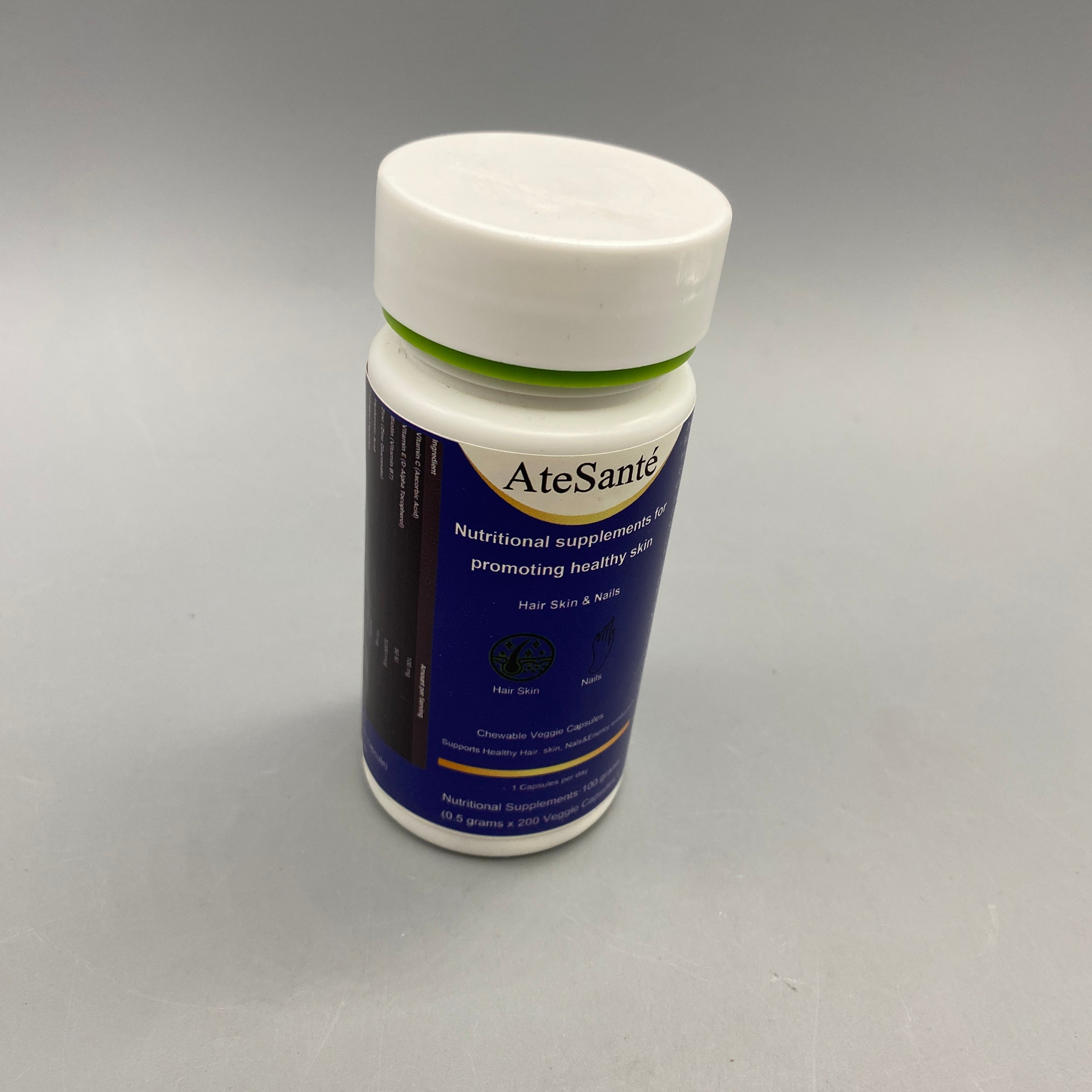 AteSanté Nutritional supplements for promoting healthy skin - 200 Chewable Veg Capsules, Vitamin C, E, Biotin, Zinc, Collagen Peptides, Hyaluronic Acid, CoQ10, Omega-3, Green Tea Extract